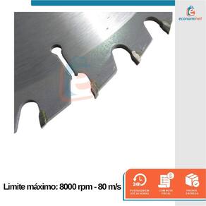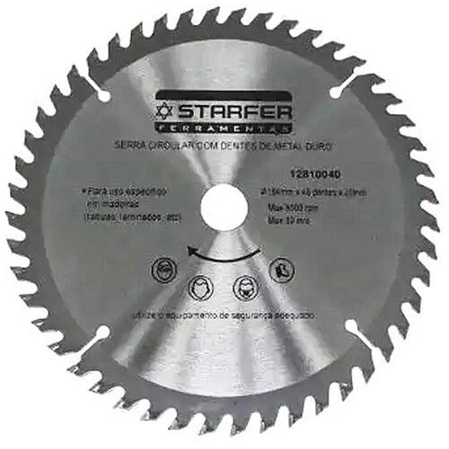 Especificações Técnicas: Material: Aço Carbono e Metal Duro Medidas: 184mm - 7.1/4” Número de dentes (widea): 48 Diâmetro do furo: 20mm Limite máximo: 8000 rpm - 80 m/s Acompanha bucha de redução Marca: Starfer Ref.: 12810040
