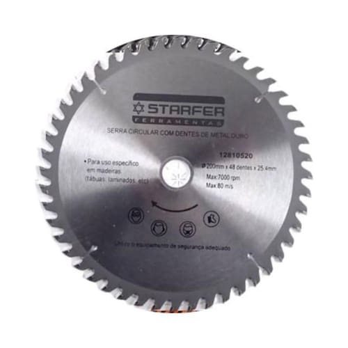 CARACTERÍSTICAS TÉCNICAS: Material: Aço carbono e metal duro Medidas: 200mm Número de dentes wídia : 48 Diâmetro do furo: 25,4mm Limite máximo: 7000 rpm - 80 m/s Espessura do disco: 2.2mm Espessura de corte: 3.2mm Marca: Starfer Ref.: 12810520 Marca: Não Informado