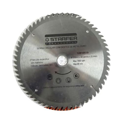 CARACTERÍSTICAS TÉCNICAS: Material: Aço carbono e metal duro Medidas: 200mm Número de dentes wídia : 60 Diâmetro do furo: 25,4mm Limite máximo: 7000 rpm - 80 m/s Espessura do disco: 2.2mm Espessura de corte: 3.2mm Marca: Starfer Ref.: 12810539 Marca: Não Informado