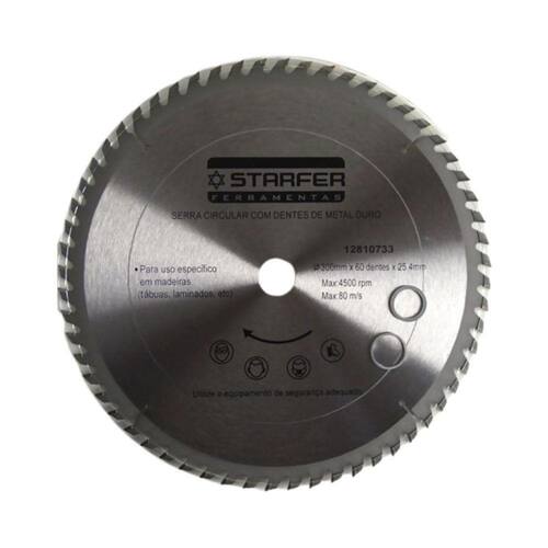 CARACTERÍSTICAS TÉCNICAS: Material: Aço carbono e metal duro Medidas: 300mm - 12 Número de dentes wídia : 60 Diâmetro do furo: 30mm Limite máximo: 4500 rpm - 80 m/s Espessura do disco: 2,5mm Espessura de corte: 3,8mm Marca: Starfer Ref.: 12810733 Ean: 7891638044893