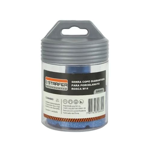 Descrição do Produto A Serra Copo Diamantada Starfer 64 mm é indicada para perfurações precisas em materiais duros, proporcionando acabamento limpo, seguro e profissional. Possui lâmina diamantada de alta resistência, ideal para aplicações de instalação e acabamento.