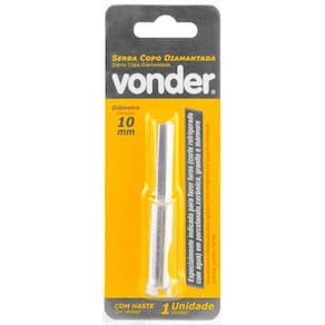 Descrição do Produto: Serra Copo Diamantada Refrigerada Com Haste 10mm Vonder 1 Serra copo diamantada refrigerada com haste Especialmente indicada para fazer furos corte refrigerado com água em porcelanato, cerâmica, granito e mármore. Rotação máxima rpm : 2.400/min. Possui corpo reforçado em aço, aresta de corte com revestimento diamantado e haste sextavada - Diâmetro da serra copo: 10 mm - Altura útil aproximada da serra copo: 35 mm - Altura da camada de diamante: 4,0 mm - Diâmetro da haste: 6,3 mm - Comprimento total da haste: 30 mm - Material da serra copo: Corpo em aço carbono e ponta diamantada