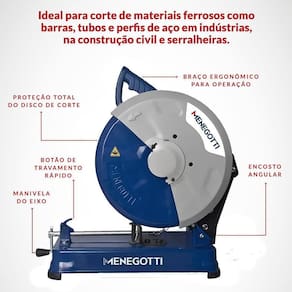 Serra corte rápido - policorte - 14 355mm 2200w msc2200 menegotti A serra policorte ideal para corte de materiais ferrosos como barras, tubos e perfis de aço em indústrias, na construção civil e em serralherias. Indicada para em trabalhos de serralheria, manutenções e metal mecânica. Dados técnicos: Modelo: msc 2200; Potência: 2200w; Rpm: 3600; Diâmetro de corte: 110mm; Ruído: 93db; Peso: 16,50kg; Dimensões c x l x a: 535 x 310 x 420 mm. Itens que acompanham a máquina: Disco para cortar aço. Marca: Não Informado