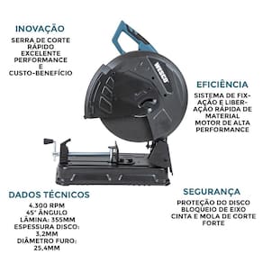 Potência nominal: em 220v: 2.300 w e em 127v - 1.800 w; Rotação: 4.300 rpm; Designação do tipo de disco: disco de corte abrasivo; Ângulo de mitra máximo: 45º; Tamanho da lâmina: 355 mm; Espessura do disco: 3,2mm; Diâmetro do furo: 25,4 mm; Peso: 14,72 kg.