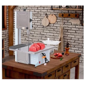Aplicação: - Residêncial e comercial - Capaz de cortar grandes peças de carne com ossos além de possuir mecanismo para moer as mesmas - Sua serra possui 181 cm de comprimento e tem uma mesa fixa para apoiar a carne, sua capacidade de corte é de peças com 29,5 cm de altura e 20,5 cm de largura - Possibilita serrar carnes, aves e peixes, moer carnes e fazer embutidos