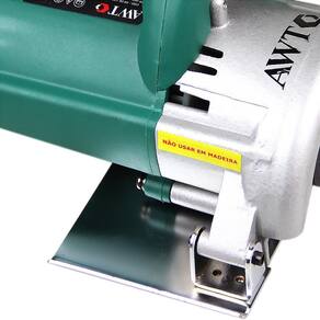 Serra mármore Possui ajuste de profundidade de corte Acesso fácil ao compartimento de carvão Na serra mármore encontra-se acoplada: Interruptor/ gatilho Botão trava do interruptor/ gatilho Flanges e parafuso do disco Base de apoio Utilizada para cortar todo o tipo de pedra, alvenaria, azulejos, tijolos entre muitas outras coisas Especificações Técnicas: Tensão: 127 V Potência: 1.300 W Velocidade: 13.000 rpm Capacidade de corte: 34 mm Diâmetro do disco: 4.3/8" (110 mm) Furo do disco: 20 mm Acessórios inclusos: 01 Chave de boca 01 Chave hexagonal Garantia: 12 meses Marca: AWT