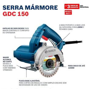 Serra Mármore Titan GDC 150 1500W 220 Volts + Maleta com 2 Discos - 06015486A4000 - BOSCH Descrição:Mais leve: a categoria é mais leve com somente 2,6 kg e possui um design compacto e ergonômico. Elevada visibilidade: placa de base com um maior campo de visibilidade do corte e maior amplitude. Placa de base amovível: remoção fácil e simples da placa de base. Características:- Potência nominal absorvida: 1500 W- Nº de rotações em vazio: 12.000 – 12.200 r.p.m.- Peso: 2,6 kg- Profundidade de corte: 26 mm- Ø do disco: 125 mm- Modo de operação: úmido Valores totais de vibração (Cortar azulejos):- Valor de emissão de vibrações ah: 4 m/s²- Incerteza K: 1,5 m/s² Informações sobre ruídos/vibrações:- Nível de pressão sonora: 95 dB(A)- Nível de potência sonora: 106 dB(A)- Incerteza K: 3 dB Cortar azulejos:- Valor de emissão de vibrações ah: 4 m/s²- Incerteza K: 1,5 m/s² Itens Inclusos:- Chave hexagonal- 2 discos de diamante