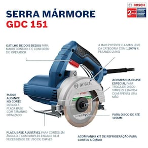 Ficha técnica: Descrição: serra de mármore gdc 151 titan 1500w Bosch Modelo: gdc 151 Potência e maior torque: 1500w Número de rotações em vazio: 12.200 por minuto Máxima capacidade de corte: 40,3 mm em 90 º e 26mm em 45º Capacidade do disco: 125mm Soft grip:sim Cortes:úmido Maior visibilidade: placa base com maior campo de visibilidade de corte e maior alcance Placa base ajustável: fácil e simples remoção da placa base