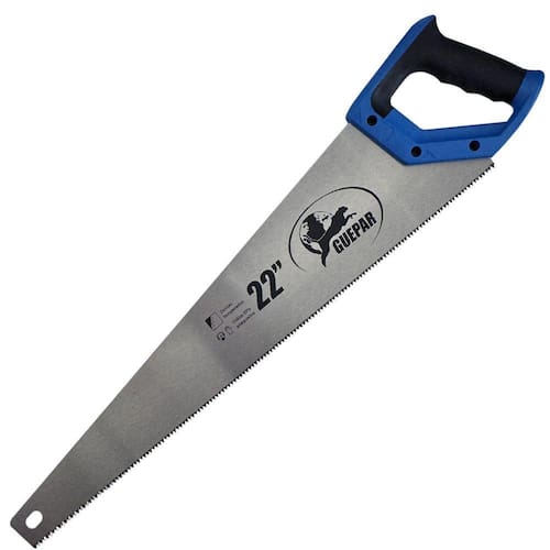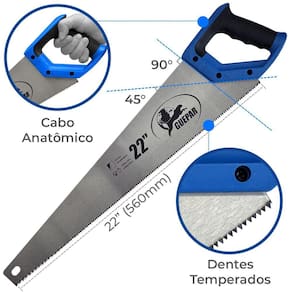 - Marca: Guepar - Referência: 861-0347 - Comprimento da lâmina: 22 Polegadas 560mm - Comprimento total: 650mm - Número de dentes por polegada: 7 dentes - Dentes temperados - Cabo emborrachamento anatômico - Corte rápido - Profissional - Conta com referência rápida de ângulos no cabo de 45 e 90 - Lâmina em aço temperado com dentes travados com dupla afiação, conferindo um corte mais rápido. - Indicado para cortes de madeira seca - Produto destinado a trabalhos na construção civil, manutenção residencial e predial - Muito utilizado por carpinteiros - Garantia: 90 dias