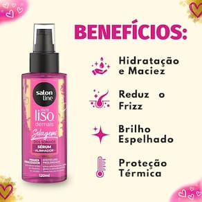 O Sérum Alinhador Salon Line Meu Liso Selagem Dos Sonhos 120ml é o tratamento definitivo para quem busca cabelos lisos, naturais e perfeitamente alinhados. Desenvolvido com uma fórmula exclusiva, este sérum atua como um primer finalizador essencial, ideal para ser aplicado antes do uso de chapinha ou secador. Ele proporciona um efeito liso prolongado e um brilho gloss incomparável, transformando a rotina de cuidados capilares em uma experiência de salão. Além de promover o ultra-alinhamento dos fios, este sérum inovador reduz significativamente o frizz e o volume excessivo, ao mesmo tempo em que oferece proteção térmica contra os danos causados pelo calor de ferramentas como chapinhas e secadores. É a solução perfeita para manter seus cabelos lisos, saudáveis e deslumbrantes.