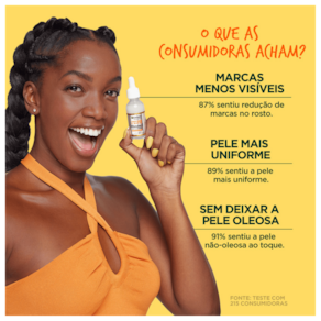 O Sérum Garnier Uniform & Matte Vitamina C possui textura de fácil aplicação e rápida absorção. Seu uso reduz as manchas na pele graças a ação antioxidante da vitamina C. Resultados comprovados pelas consumidoras: 87% das consumidoras sentiu redução das marcas, 90% sentiu textura não oleosa e 87% sentiu a pele mais uniforme e mais hidratada.