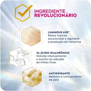 Sua fórmula deixa a pele uniforme e com mais luminosidade. Enriquecido com ácido hialurônico e Vitamina E, previne o surgimento de novas manchas.