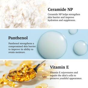 - - [INGREDIENTES PRINCIPAIS] incluem ceramida NP que forma uma camada protetora e hidratante na superfície da pele para ajudar a fortalecer a barreira cutânea e melhorar a hidratação e elasticidade, pantenol que hidrata, acalma e fortalece uma barreira cutânea comprometida para melhorar sua capacidade de reter umidade e vitamina E, conhecida por rejuvenescer e reparar as células da pele para preservar a aparência jovem.