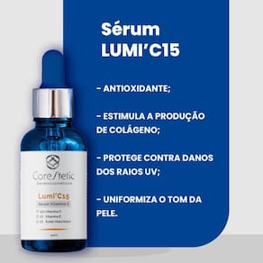 Sérum lumic15, enriquecido com um blend de vitamina c, que impulsiona a firmeza da pele ao estimular a produção de colágeno. Este sérum combate os radicais livres, ilumina manchas, reduz linhas finas de expressão, atua como antioxidante e protege a pele contra os danos causados pelos raios uv. Componentes ativos: Vitamina c: possui propriedades antioxidantes, neutralizando os radicais livres que causam danos à pele e aceleram o envelhecimento. Essencial para a produção de colágeno, promovendo firmeza e elasticidade. Trata e previne problemas comuns, como manchas escuras, hiperpigmentação, rugas e linhas finas. Vitamina e: antioxidante, e hidratante. Combate os radicais livres, conferindo brilho e luminosidade à pele. Potencializa os efeitos da vitamina c. Ácido hialurônico: destaca-se pela ação hidratante, preenchendo o espaço intercelular. Confere à pele um aspecto rejuvenescido pelo intumescimento do ativo por água. Torna a pele mais macia e suave, atuando tanto na superfície quanto nas camadas mais profundas. Principais benefícios: Antioxidante Estimula a produção de colágeno Combate os radicais livres Protege contra danos causados por raios uv Uniformiza o tom da pele Modo de uso Uso diário, manhã e noite. Com a pele limpa e seca, aplique 5 cinco gotas do produto no rosto e pescoço, espalhando até completa absorção. Use protetor solar heal sun fps60 após o uso diurno. Composição Aqua água , ascorbic acid ácido ascórbico , glycerin glicerina , sodium hyaluronate hialuronato de sódio , tocopheryl acetate acetato de dextroalfatocoferol , dicaprylyl carbonate carbonato de dicaprilil , cellulose gum carmelose sódica , sodium benzoate benzoato de sódio , potassium sorbate sorbato de potássio , parfum perfume disodium edta edetato dissódico di-hidratado .