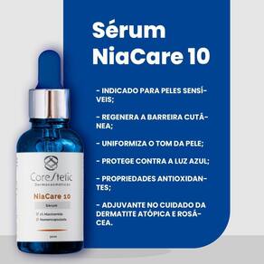 O sérum niacare 10 é um sérum facial de textura elegante, desenvolvido com tecnologia inovadora que combina o ativo encapsulado niacinamide com uma base sérum, atuando eficazmente no auxílio e cuidado de dermatites atópicas e rosáceas, além de promover o clareamento da pele. A encapsulação possibilita a entrega inteligente e segura do ativo no alvo de ação, garantindo uma maior eficácia do dermocosmético. Componentes ativos: niacinamide - as nanopartículas de niacinamide apresentam um tamanho médio superior a 200nm, proporcionando segurança e proteção ao ativo contra a hidrólise comum às estruturas carbonílicas, como a do ativo livre niacinamida. A encapsulação do ativo assegura a estabilidade e maior eficácia do produto. Além disso, o niacinamide melhora a permeação cutânea da substância, chegando à derme em sua forma ativa, sem perda por degradação. Principais benefícios: Indicado para peles sensíveis Regenera a barreira cutânea Uniformiza o tom da pele Protege contra a luz azul Propriedades antioxidantes Coadjuvante no cuidado da dermatite atópica e rosácea Experimente o sérum niacare 10 para desfrutar dos benefícios avançados na regeneração da barreira cutânea, no clareamento da pele e no cuidado de dermatites atópicas e rosáceas, tudo com a elegância de uma formulação de alta tecnologia. Modo de uso: Uso diário, manhã e noite. Com a pele limpa e seca, aplique 5 cinco gotas do produto no rosto e pescoço, espalhando até completa absorção. Use protetor solar heal sun fps60 após o uso diurno. Composição: Aqua água , propanediol propanodiol , cocos nucifera fruit extract extrato de coco , algin alginato de sódio , niacinamide nicotinamida , sodium benzoate benzoato de sódio , potassium sorbate sorbato de potássio , decyl glucoside decil glicosídeo , parfum perfume , citric acid ácido cítrico , calcium citrate citrato de cálcio .