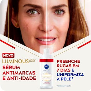 O Sérum Nivea Anti-Idade Luminous Cellular 630 30ml foi especialmente desenvolvido para atuar na redução de marcas escurecidas da pele, apresentando resultados visíveis em duas semanas. Com ácido hialurônico, ele preenche profundamente as rugas em 7 dias. Além disso, estimula a produção de colágeno, ajudando na recuperação de volume e firmeza da pele, este sérum conta também com Luminous 630®, um ingrediente que atua em nível celular e que é resultado de pesquisas minuciosas realizadas durante 10 anos. Seu efeito antimarcas é comprovado em todos os tons de pele, deixando-as uniformes e iluminadas. Benefícios: - O FPS 60 garante alta proteção solar; - Efeito matte instantâneo e duradouro; - Proteção por dentro e por fora ; - Não obstrui os poros; - Dermatologicamente e oftalmologicamente testado; - Fórmula com cor média; - Previne o envelhecimento da pele; - Textura leve; - Controla a oleosidade; - Poderoso efeito antioxidante natural.