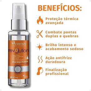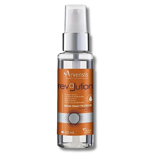 O Sérum Termo Protetor Arvensis Revolution é um finalizador multifuncional desenvolvido para blindar os fios contra os danos causados por fontes de calor, como secador, chapinha e modeladores. Sua fórmula exclusiva combina ativos tecnológicos e silicones especiais, que formam uma película protetora ao redor da fibra capilar, prevenindo quebras, pontas duplas e o ressecamento provocado pelas altas temperaturas. Além da proteção térmica, o sérum oferece efeito antifrizz duradouro, hidratação leve, brilho intenso e toque sedoso. É o aliado ideal para quem faz escova ou usa chapinha com frequência, ajudando a manter os cabelos alinhados, saudáveis e com aparência profissional. Sua textura leve e não oleosa é rapidamente absorvida pelos fios, garantindo um acabamento natural e elegante, sem pesar ou deixar resíduos.