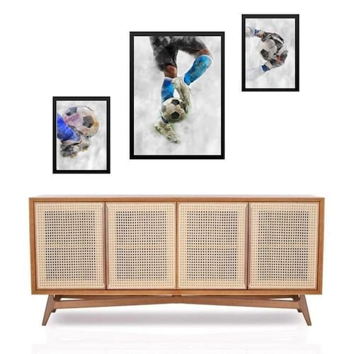 Set 3 quadros futebol aquarela Cor: moldura preta Informações do produto tire todas as suas dúvidas no descritivo abaixo: decoração para quarto, sala, cozinha, escritório, área gourmet e muito mais. Chega de paredes vazias medidas - kit composto por 3 quadros, sendo 2 quadros com 24x33cm e 1 quadro com medida 33x45cm. Material do papel - papel fotográfico brilhante de altíssima resolução acabamento - todos os quadros são acompanhados de uma película de acetato para proteção da imagem. - os quadros são embalados de forma segura com plástico bolha com camada dupla de acordo com o tamanho dos quadros. Garantia - garantia de 3 meses. Meu quadro chegou. Como posso fixá-lo Você precisa apenas de um martelo e um prego, pois os quadros já vão acompanhados de penduradores. Esta é a forma mais indicada. Caso prefira, você pode utilizar uma fita dupla face neste caso, sugerimos de alta qualidade para evitar que descole e seu quadro caia . Como posso limpar meu quadro A limpeza é feita como um móvel comum da sua casa. Apenas um pano seco ou espanador são suficientes para tal