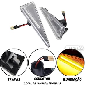 O produto é novo, com garantia, e importado. Trata-se de um pisca de direção lateral com acendimento sequencial. A cor da luz LED é âmbar, enquanto a cor externa é transparente. A caixa é feita de ABS e as luzes são de LED.