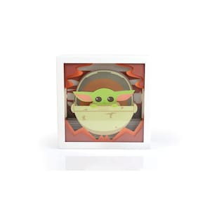 - Design divertido: esta caixa de sombra apresenta uma cena em camadas de The Child, também conhecido como Baby Yoda, de Star Wars: The Mandalorian. A caixa de luz de sombra 3D retrata a criança sentada em uma carruagem flutuante contra um cenário de deserto.