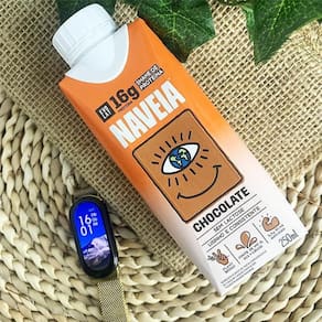 O shake proteico vegano chocolate naveia é uma bebida plant-based com 16g de proteína de ervilha e vitaminas d e b12.