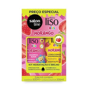 O Kit de Shampoo e Condicionador de Morango da linha Meu Liso Kids da Salon Line foi criado especialmente para cuidar dos cabelos infantis, proporcionando hidratação, brilho, ultramaciez e controle do frizz. Com uma fórmula suave e segura, limpa delicadamente, desembaraça os fios com facilidade e garante cabelos alinhados, macios e com um cheirinho delicioso de morango. Mantém os fios saudáveis e nutridos, realça o brilho natural dos cabelos e deixa os fios mais suaves ao toque. Além de manter os cabelos alinhados e sem frizz. Ideal para cabelos infantis lisos ou levemente ondulados ou para crianças com cabelos que precisam de hidratação, brilho e controle de frizz.