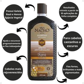 Shampoo antiqueda efeito antigrisalho o shampoo efeito antigrisalho possui geleia real e henna egípcia vegetal, ajuda a escurecer progressivamente os fios indesejados. Cabelos mais rejuvenescidos, fortes, brilhantes, mais pigmentados e com aparência natural. Proporciona cor gradual aos cabelos grisalhos, não cobrindo-os completamente e não atuando no nivel do bulbo capilar. Resultados visiveis a partir de 30 aplicações da linha completa. Para cabelos castanhos a escuros. . Ingredientes de origem natural geleia real: conhecida por ser rica em nutrientes, vitaminas e aminoácidos. Henna egípcia vegetal: conhecida por escurecer o cabelo, promovendo uma cor uniforme e redução dos fios indesejados, como os grisalhos. . Modo de uso aplique nos cabelos molhados e massageie o couro cabeludo até formar espuma. Enxágue bem. . Composição água, lauriletersulfato de sódio, cocoamidopropilbetaína, cloreto de sódio, óxido de lauramidopropilamina, perfume, fenoxietanol, dimetil lauramida/miristamida, propilenoglicol, poliquatérnio-7, cloreto de goma guar hidroxipropiltrimônio, óxido de miristamidopropilamina, glicerol, caprililglicol, extrato de geléia real, ácido cítrico, corante preto 77266, crospovidona, azul básico 99, marrom básico 16, corante violeta 60730, vermelho básico 76, amarelo básico 57, hena , decilenoglicol, hexil cinamal, limoneno. . Código de registro sanitário anvisa 25351.199625/2024-46