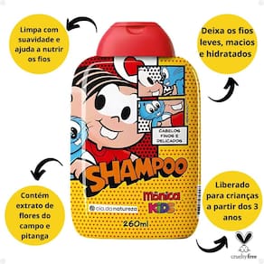 O Shampoo Mônica Kids Cabelos Finos e Delicados contém extrato de flores do campo e pitanga, que proporcionam nutrição e vitalidade, deixando os fios macios e hidratados. O Shampoo limpa com suavidade os cabelos, deixando-os leves, macios e com um deliocioso cheirinho. Fragrancia deliciosa. Não irrita os olhos. Liberado para crianças a partir de 03 anos.
