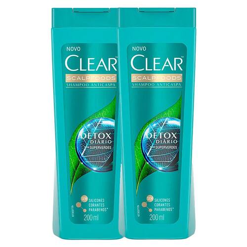 SHAMPOO CLEAR DETOX DIÁRIO 200ML Shampoo Anticaspa. Sem silicones, corantes e parabenos. Detox Diário: Renove seu couro cabeludo diariamente. Zero caspa. Com o potente complexo natural de superverdes, composto por Chá Verde, Kiui, Pepino e tecnologia anticaspa de Clear. Remoção dos resíduos e nutrição diária para um couro cabeludo saudável. Modo de usar: Aplique no cabelo molhado. Massageie o couro cabeludo. Enxague. Repita para melhores resultados, use diariamente. Ean: 7891150055698