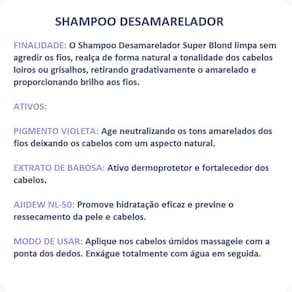 Finalidade: o shampoo desamarelador super blond limpa sem agredir os fios, realça de forma natural a tonalidade dos cabelos loiros ou grisalhos, retirando gradativamente o amarelado e proporcionando brilho aos fios.