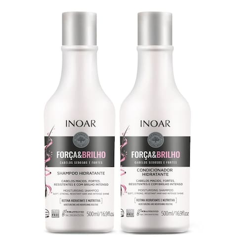 O kit Inoar Força e Brilho apresenta uma poderosa fórmula vegana que revitaliza e fortalece os fios, e garante cabelos mais fortes, brilhantes e macios ao toque, com redução visível de frizz, opacida