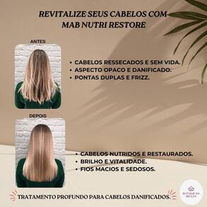 para potencializar os resultados, utilize a linha completa mab nutri restore, incluindo máscaras e finalizadores específicos. - evite o uso excessivo de ferramentas térmicas e proteja os cabelos do sol para manter a saúde e a integridade dos fios.