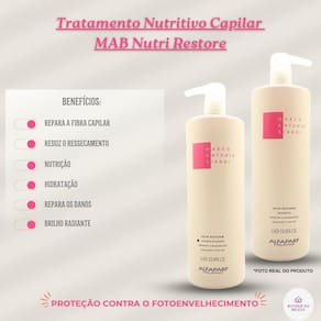 Revitalize seus cabelos danificados com o kit mab nutri restore, composto por shampoo e condicionador desenvolvidos para reparar e nutrir profundamente os fios.