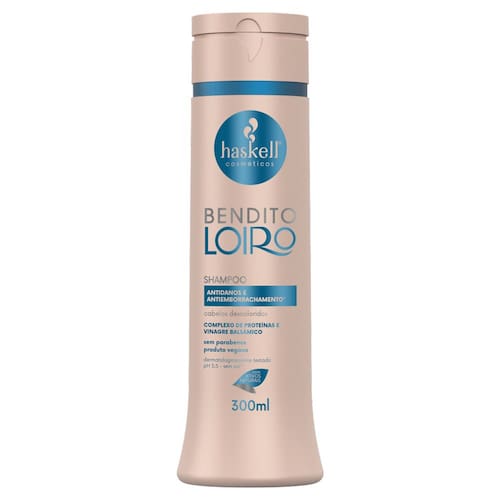 Shampoo Haskell Bendito Loiro 300ml Indicação: cabelos descoloridos. Prepara o cabelo para o tratamento intensivo. Possui pH equilibrado e evita a alta rigidez característica de shampoo. Ideal para re