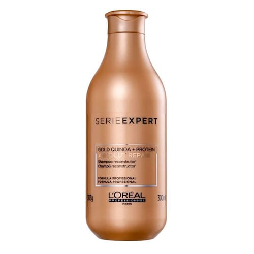 O Shampoo Absolut Repair Gold Quinoa + Protein L'Oréal Professionnel traz ativos que ajudam restaurar a superfície dos fios para que o cabelo revele uma aparência mais saudável. Seu visual ganha muito mais brilho e um toque macio incrível. Desenvolvido com Gold Quinoa + Protein rico em vitaminas E e do complexo B, conta com a proteína completa, que auxilia na profunda reestruturação da fibra danificada enquanto criam um filme que confere força e proteção aos fios, prevenindo danos futuros.