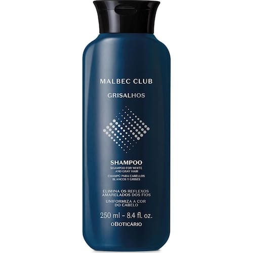 Shampoo Masculino Malbec Club Grisalhos 250ml O Boticário Shampoo Malbec Club Grisalhos 250ml O Shampoo Malbec Club Grisalhos é feito para homens com cabelos grisalhos ou com alguns fios brancos. Ideal para a rotina masculina de autocuidado, este shampoo possui fórmula com 2x mais ativo desamarelador, neutralizando e prevenindo o tom amarelado do cabelo. Além disso, uniformiza a cor e realça o brilho dos fios. Com fórmula inovadora, contém extrato de semente de uva, ativo com ação antioxidante que auxilia nos cuidados com a pele. Confira os benefícios deste shampoo para grisalhos: 2x mais ativo desamarelador; Uniformiza a cor dos fios; Previne o tom amarelado; Proporciona mais brilho. Com o uso contínuo, você terá um aliado nos cuidados com a cor dos seus fios, eliminando os reflexos amarelados dos cabelos e deixando-os mais bonitos. Com nova fórmula, nova embalagem e nova fragrância que traz o encontro da perfumaria e cuidados, a Linha Malbec Club Grisalhos aprimorou sua performance para atender às necessidades de cuidados masculinos. Para homens que estão sempre em busca de mudanças para o melhor, a linha Malbec Club Grisalhos dá mais vida aos seus cabelos e mais autoestima ao seu dia a dia
