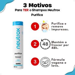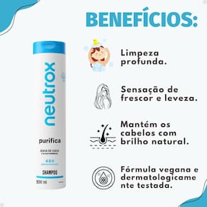 Shampoo Neutrox Purifica 300ml: Limpeza Profunda e Frescor Duradouro para Seus Cabelos O Shampoo Neutrox Purifica 300ml foi desenvolvido para proporcionar uma limpeza profunda e refrescante aos cabelos, removendo impurezas e o excesso de oleosidade. Com uma fórmula equilibrada, ele purifica os fios sem ressecar, deixando-os leves, soltos e com sensação de frescor. Ideal para o uso diário em todos os tipos de cabelo, o Shampoo Neutrox Purifica também prepara os fios para receber os tratamentos da linha Neutrox, proporcionando hidratação e revitalização. Sua fórmula exclusiva com água de coco e algas marinhas atua em conjunto com os demais ingredientes para remover impurezas e controlar a oleosidade por até 48 horas, sem ressecar os fios. Proporciona uma sensação de leveza e frescor desde a raiz, mantendo os cabelos soltos e revitalizados, com o equilíbrio perfeito entre limpeza e hidratação.