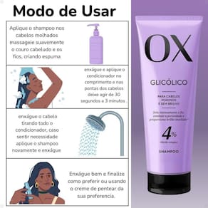 A linha Ox Glicólico é a ideal para cabelos porosos e sem brilho. Isso porque o Glicolic complex combinado ao sistema OX Bela Duradoura, é a fórmula certa para selar intensamente os fios, combater a porosidade e proporcionar brilho imediato.O SISTEMA OX é uma tecnologia exclusiva, capaz de liberar sequencialmente os ingredientes, proporcionando um tratamento prologado aos fios. . Modo de Uso Aplique o Shampoo Ox nos cabelos molhados massageando-os por alguns minutos. Enxágue e repita a aplicação. Após lavar o cabelo com o Shampoo, aplique um Condicionador nos cabelos ainda molhados, do comprimento às pontas. Deixe agir por alguns minutos e, em seguida enxágue. . Como o ácido glicólico beneficia os cabelos O ácido glicólico ajuda a remover as células mortas do couro cabeludo,promovendo a renovação celular e melhorando a saúde do cabelo. Posso usar o shampoo e condicionador diariamente Sim, são seguros para uso diário. Os produtos são indicados para cabelos quimicamente tratados Sim, são ideais para cabelos danificados e tratados quimicamente. O que posso esperar após o uso Cabelos mais macios, brilhantes e com menos frizz. Os produtos têm fragrância Sim, possuem uma fragrância agradável que deixa os cabelos perfumados. . Código de Registro Sanitário ANVISA Shampoo: 23351.353115/2024-21 Marca: Não Informado Ean: 7908324408683