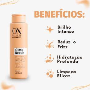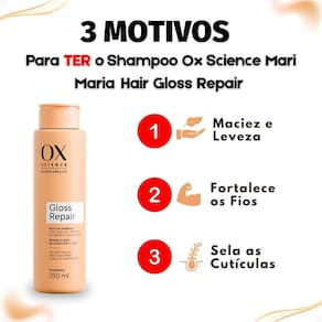 O Shampoo Ox Science Mari Maria Hair Gloss Repair 250ml limpa suavemente os fios enquanto inicia o tratamento reparador da linha Gloss Repair. Com tecnologia avançada e ativos poderosos como Óleo de Linhaça Dourada, Niacinamida e Algas Marinhas, ele atua desde a primeira lavagem para restaurar a fibra capilar, reduzir o frizz e devolver o brilho intenso e o toque macio aos cabelos. Desenvolvido pela parceria entre OX e Mari Maria Hair, o shampoo promove uma limpeza eficaz sem agredir os fios, deixando-os leves, soltos e com aspecto saudável.