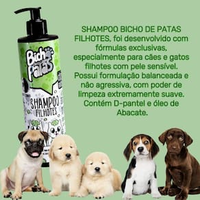 Shampoo para filhotes bicho patas - com dpantenol e abacate Shampoo bicho de patas filhotes, foi desenvolvido com fórmulas exclusivas, especialmente para cães e gatos filhotes com pele sensível. Possui formulação balanceada e não agressiva, com poder de limpeza extremamente suave. Contém d-pantel e óleo de abacate. Modo de usar: aplique o shampoo por toda a pelagem molhada do pet e massageie-a. Em seguida enxágue bem. Repita a operação se necessário, para melhores resultados finalize com o condicionador bicho de patas. Marca: Não Informado Ean: 7897163318225
