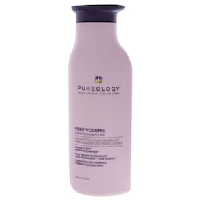 O shampoo pureology pure volume aumenta o volume e restaura o movimento em cabelos lisos e tratados com cores finas com os principais ingredientes proteína de trigo e extrato de folha de eucalipto e uma mistura aromaterapêutica exclusiva de toranja rosa, rosa selvagem e madeira de cedro.