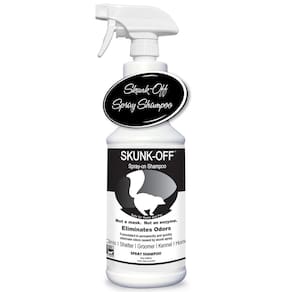 - Tough On Skunk Odors: use este spray de mesa para cães para remover permanente e imediatamente o cheiro de gambá na primeira aplicação, economizando tempo e dinheiro. Este removedor de odor de gambá para cães, gatos e animais de estimação penetra até a fonte do odor, onde outros sprays removedores de odor de gambá para animais de estimação tratam apenas problemas de superfície.