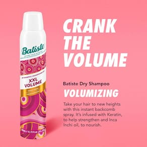 Batiste Shampoo Seco Grande e Bouncy XXL Volume. O volume Batiste XXL revitaliza o cabelo, elimina as raízes oleosas e dá a você muito corpo e textura, seu penteado não leva tempo. Uma explosão rápida com nossa fórmula exclusiva dá aos cabelos opacos e sem vida a transformação volumosa de que necessita. Sem água e sem pentear - apenas glamour de estilo grande e uma ótima sensação de limpeza e frescor. Não precisa se preocupar em pular um shampoo.