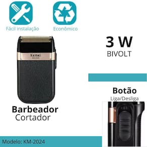 Descrição do anúncio: Barbeador elétrico kemei 2024 bivolt recarregável Agora você pode ficar sempre com a barba perfeita com o barbeador portátil de lâmina dupla kemei. Ideal para pessoas que têm alergia a lâminas tradicionais como gillette ou navalhas, o kemei 2024 oferece um método de barbear menos agressivo e sem irritação. Este shaver é recarregável via usb, levando 8 horas para uma carga completa e oferecendo 60 minutos de uso contínuo. Com suas duas lâminas, ele proporciona um corte mais rápido e eficiente. Importante: para melhores resultados, utilize uma máquina zero antes de usar o shaver em pelos curtos.
