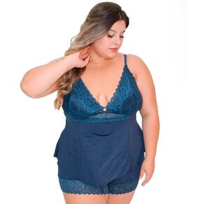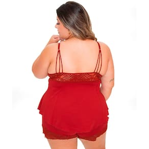 O Short Doll Plus Size Amanda fica lindo no corpo! O modelo sem bojo é muito confortável para dormir e veste super bem. Possui detalhes em strappy nas costas, acrescentando um toque a mais na peça; detalhes em renda no busto, abaixo dos seios e na orla do short para você arrasar! Contém um decote em "v" para trazer mais sensualidade para as suas noites.