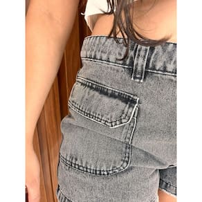 O short é uma peça jeans de lavagem escura e cintura alta. Ele tem um corte mais curto, com a barra desfiada e algumas costuras visíveis na parte frontal, que ajudam a modelar a peça. O design inclui bolsos grandes e utilitários, e o fechamento parece ser por zíper e botão. Marca: Não Informado