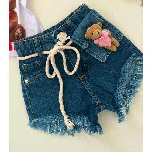 Short jeans feminino infantil moda blogueirinha, composto por 2 peças, sendo elas um short jeans com cintura ajustável, detalhes em desfiádo e uma linda polchete jeans fechamento em botão de pressão com ursinho tornando esse look perfeito e confortáve.