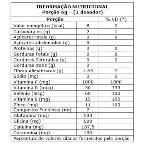 Polidextrose, Polpa de limão, Gengibre em pó, Ácido ascórbico (vitamina C), Extrato de rizomas de cúrcuma longa (Curcumina), Cúrcuma em pó, Camu camu em pó, Espirulina (Arthrospira platenses), Chlorella em pó (Ácido alfa-linolênico n-3 obtido de chlorella vulgaris, Pimenta preta em pó, Selenito de sódio (Selênio), Bisglicinato de zinco (Zinco), Acetato de alfa tocoferol (Vitamina E), Glutamina, Glicina, N acetil cisteína, Edulcorante glicosídeos de esteviol, Canela em pó, Extrato de própolis verde, Colecalciferol (vitamina D), Aroma idêntico ao natural, Espessante goma guar, Goma xantana e Antiumectante dióxido de silício.