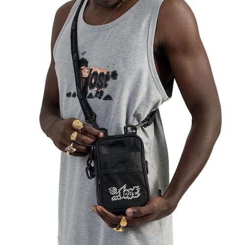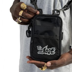 Shoulder Bag Lost com compartimento principal, compartimento em tela, estampa frontal e etiquetas personalizadas.