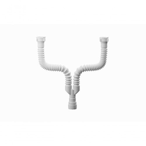 Corrige desalinhamentos entre cuba e tubulação de despejo. Ideal para tanques, pias e cubas duplas. Acabamento Branco. Produto suporta água fria e quente até 90C. Compatível com tubos e conexões de 40 e 50mm